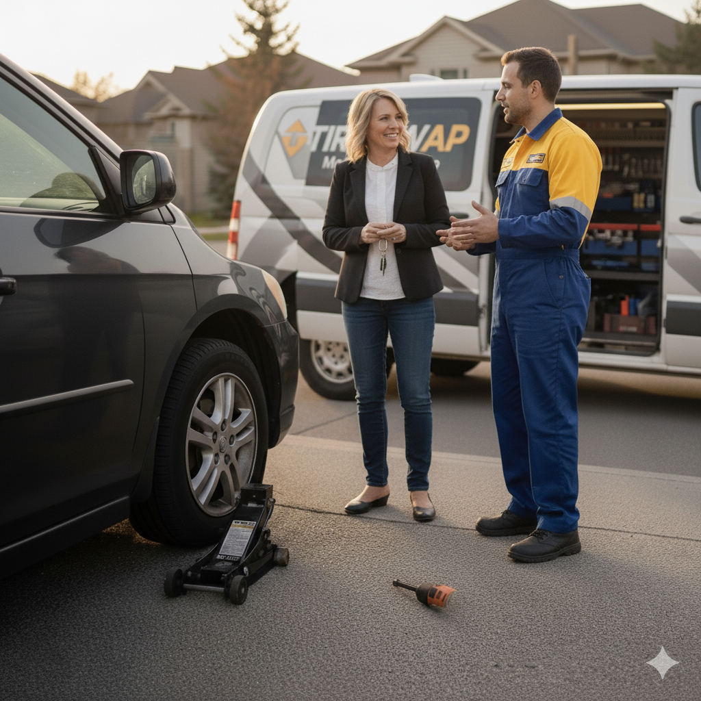 Get back on the road quickly with Tireswap's mobile spare tire change service in Cleveland. Fast, reliable, and professional!